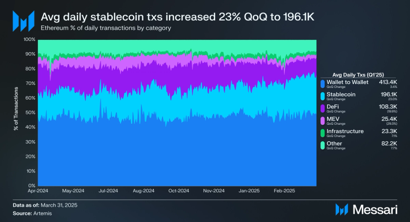 The majority of transactions in Q1 were driven by two categories: wallet-to-wallet and stablecoins. Wallet-to-wallet transactions have historically been the predominant driver of transaction activity on Ethereum, and Q1 was no exception. Daily average transactions for this category increased 3% QoQ to 413,400, and accounted for 49% of all transactions in Q1. Stablecoin transactions saw the biggest QoQ increase in Q1, with the daily average up 23% QoQ to 196,100 (23% of all transactions). Combined, wallet-to-wallet and stablecoin transactions accounted for 72% of all transactions in Q1 (up 6% QoQ from 68%). On the other hand, daily average transactions related to DeFi (down 20% QoQ to 108,300) and MEV (down 29% QoQ to 25,400) saw decreases.