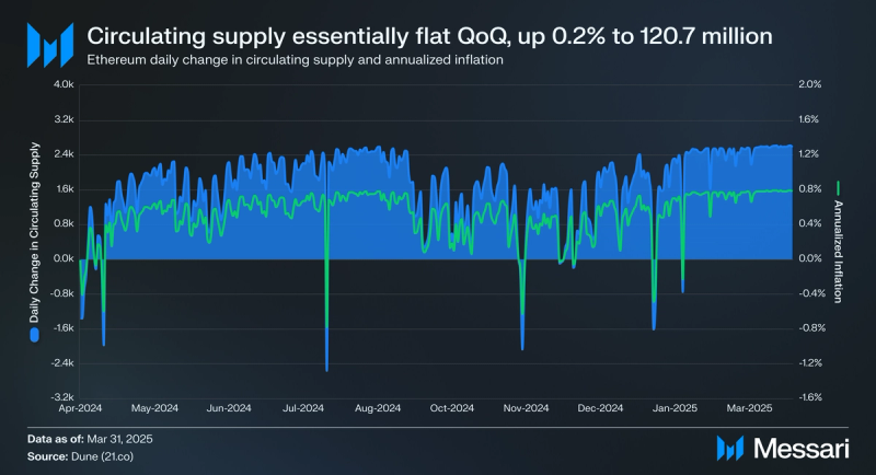 As such, when issuance > burn, Ethereum’s circulating supply is inflationary. Circulating supply has been increasing since Q2’24 due to decreasing network usage. As for Q1, Ethereum’s circulating supply increased by 0.2% QoQ from 120.5 million to 120.7 million. Furthermore, Ethereum’s annualized inflation rate stood at 0.6% (up 76% QoQ from 0.3%) by quarter end.