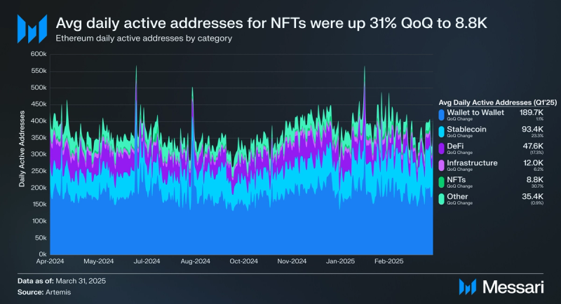 NFT volumes pulled back after surging in Q4 when popular NFT projects like Pudgy Penguins and Remilia launched their own tokens. With the hype from these token launches dying down, weekly average NFT volume fell 25% QoQ from $99.1 million to $74.1 million.