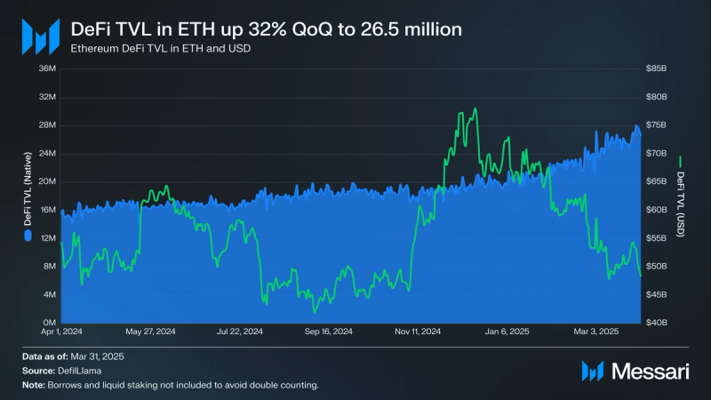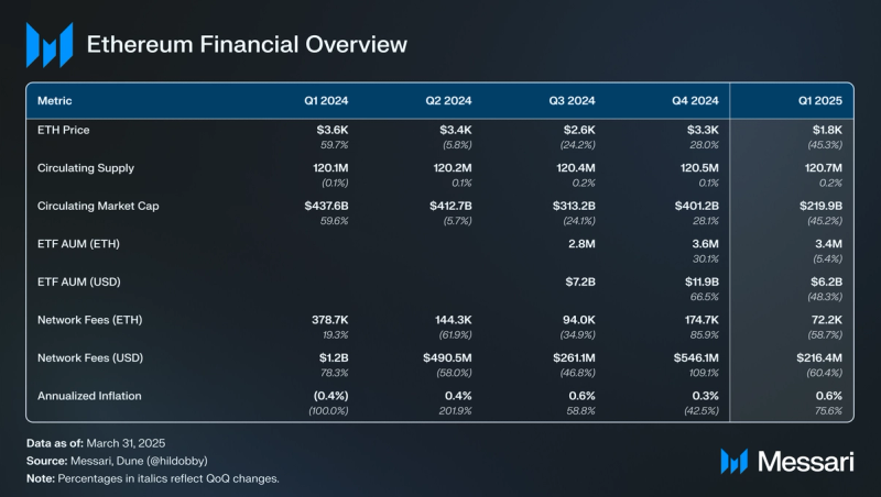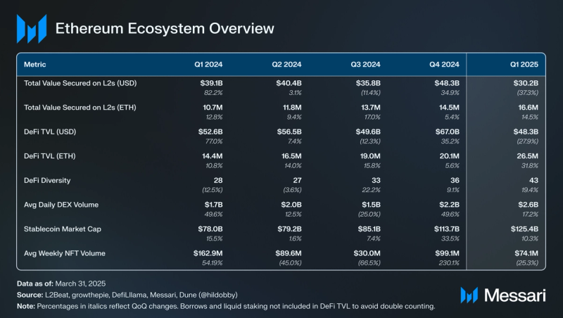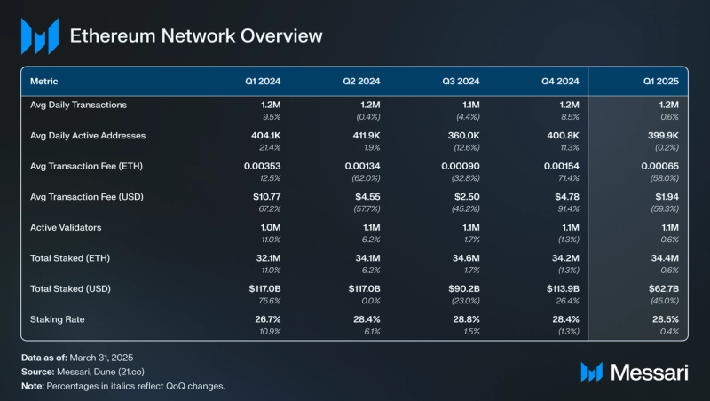 Ethereum faced significant headwinds in Q1 2025, from macroeconomic pressure and price underperformance to declining network fees and DeFi TVL. Yet amidst this turbulence, the network demonstrated resilience across its L2 ecosystem, staking infrastructure, and stablecoin economy. Key protocol upgrades like Pectra signal long-term investment in scalability and usability, even as near-term market sentiment remains cautious.