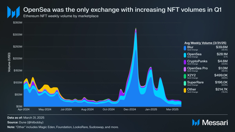 Most NFT exchanges experienced a decline in volumes as a result, except for OpenSea. OpenSea confirmed an upcoming token launch in February 2025, which has led users to shift volumes to the platform in hopes of an airdrop. Weekly average volumes on OpenSea increased 9% QoQ from $25.9 million to $28.1 million. Combined with Blur, the 2 NFT exchanges accounted for 91% of NFT volume on Ethereum this quarter.