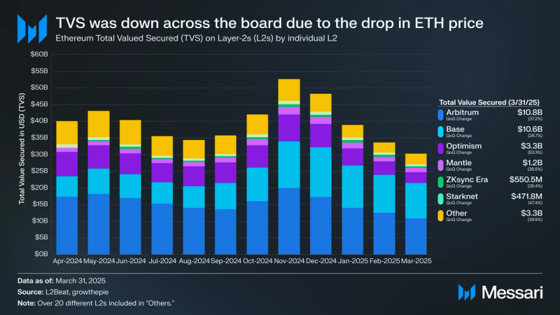 Total Value Secured (TVS) measures the sum of all assets on Ethereum L2s. The competition for TVS among L2s remains intense, with new entrants emerging each quarter and mercenary capital moving from chain to chain. The majority of TVS has gravitated towards 2 L2s: Arbitrum and Base. Base has been steadily gaining ground on Arbitrum over the past few quarters, and nearly surpassed it in Q1. However, both L2s ended up with declines in TVS due to a decrease in crypto prices. Arbitrum’s TVS decreased 37% QoQ to $10.84 billion, representing 36% of all TVS, while Base’s TVS decreased slightly less at 29% QoQ to $10.61 billion, representing 35% of all TVS. Combined, the 2 accounted for 71% of TVS, up 6% QoQ. No L2 within the top 6 had a QoQ increase in TVS.