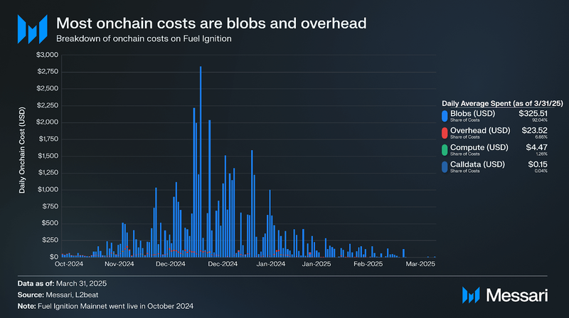 Onchain costs on Fuel Ignition can be an indicator of network activity, rising in response to increased usage and declining when activity slows. Blobs and calldata relate to data storage and availability, while compute covers transaction execution and overhead accounts for fixed operational expenses. Rollup operators optimize costs by minimizing calldata usage (favoring blobs) and reducing compute intensity through efficient execution models like parallel processing.