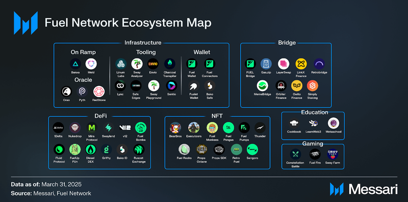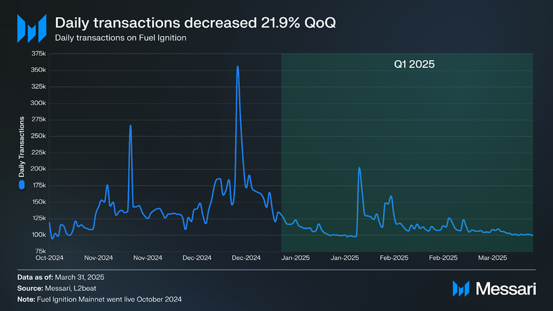In Q1 2025, Fuel demonstrated significant progress in ecosystem expansion and network adoption following the launch of Fuel Ignition and the TGE of FUEL. With Q1 being a rough quarter for most projects, FUEL was not immune to a decrease in most metrics. Despite this, the FUEL team continued to develop and ship products. The growth of DeFi protocols like Swaylend, Mira Protocol, and Fluid Protocol highlights the network’s growing adoption and diversity of product offerings.