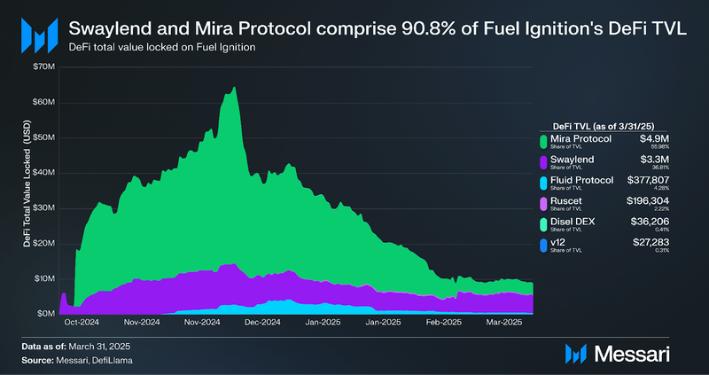 - Fuel’s Ignition’s leading DeFi applications, Swaylend and Mira Protocol, account for 90.7% of DeFi TVL.