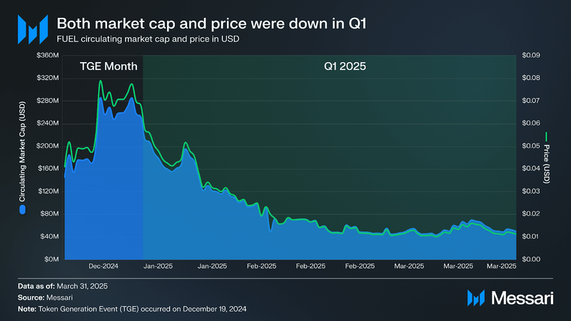 Q1 2025 was the first full quarter since FUEL’s TGE on December 19, 2024. During the quarter, FUEL’s circulating market cap decreased 79.8% to $49.9 million from $247.3 million, and the token price declined 83.5% to $0.01 over the same period.