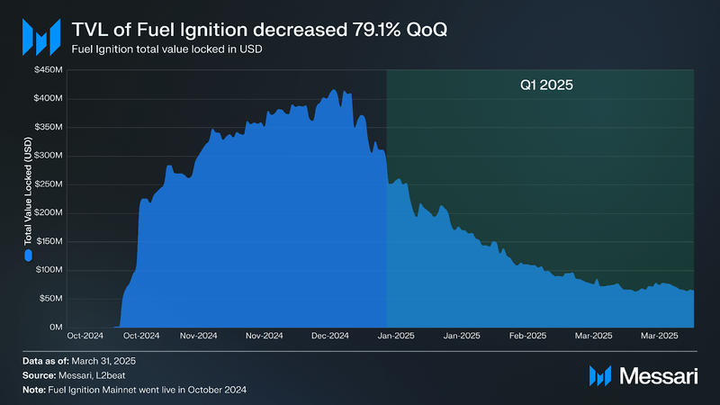 Fuel Ignition’s TVL decreased from $310.9 million in Q4 2024 to $64.9 million in Q1 205, marking a decline of 79.1% QoQ as the network usage normalized post-TGE hype.