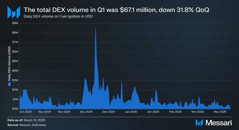 Mira Protocol is the top DEX on Fuel Ignition, with over 99% of the market share. Since the launch of Fuel Ignition, Mira has facilitated over $164.5 million in volume. The significant spike in DEX volume can be attributed to the launch of FUEL on Dec. 19, 2024. In Q1 2025, the daily average DEX volume was $745,173, down 45.5% QoQ from $1.4 million in Q4 2024.