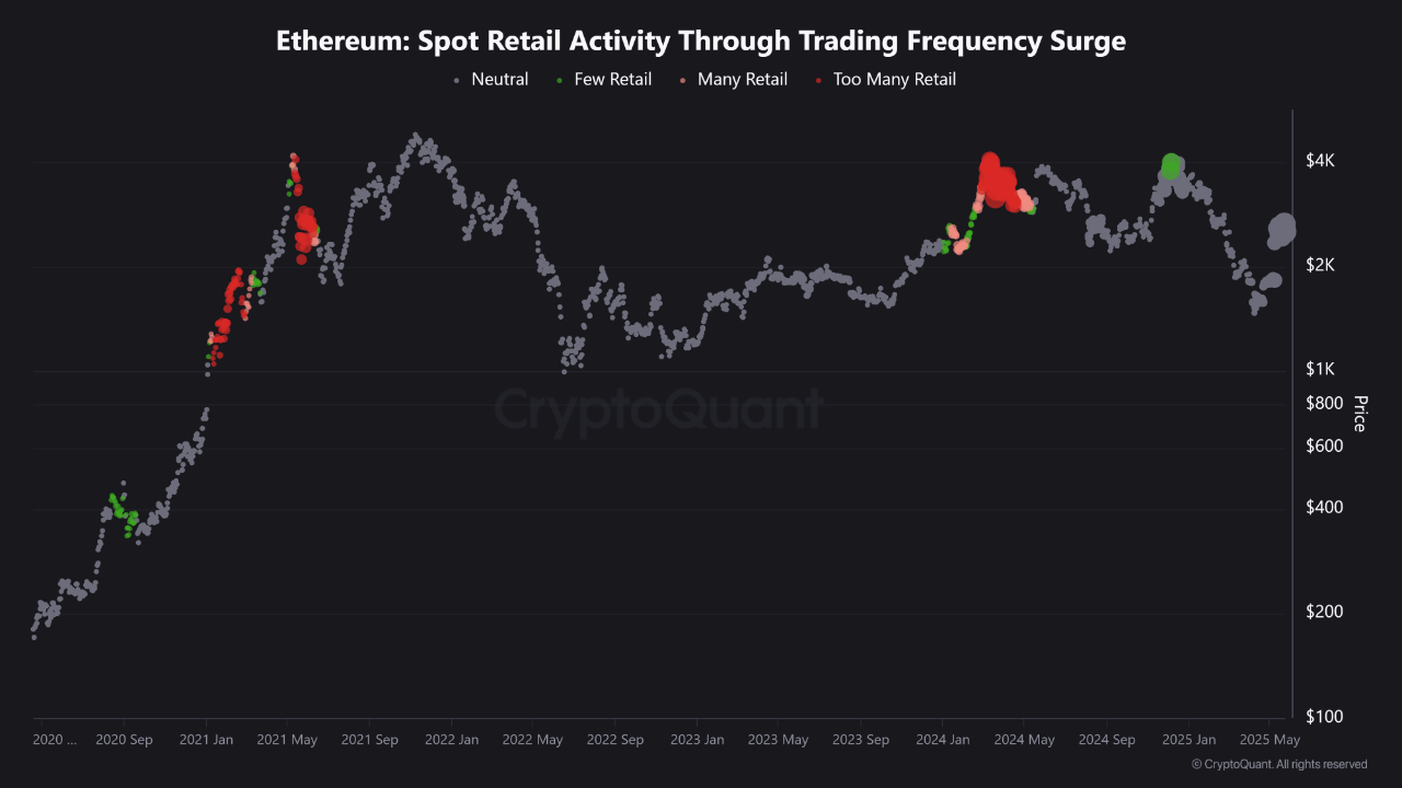 Every time ETH hits a local peak, a spike in retail activity almost always follows. This was especially evident in 2021, when market euphoria made anyone with an exchange account feel like a strategist. But now? It’s a different story.