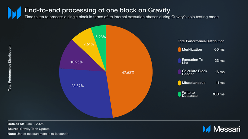 Traditional EVM chains are primarily constrained by transaction execution bottlenecks, while Gravity has significantly reduced execution time by introducing Grevm and optimizing the cache layer of Gravity storage. Based on the solo tests, the system’s overall performance is currently constrained by two key technical challenges. First, the process of converting transaction data into Merkle Trees (called Merklization) is still relatively slow and consumes a large share of processing time. Second, limitations in how quickly data can be read from or written to the storage system, known as I/O bottlenecks, further restrict the speed of execution. These issues reduce the system’s ability to fully take advantage of its parallel processing capabilities, which can lead to slower response times for users in high-demand situations. Gravity will look to improve on these bottlenecks to continually achieve better performance.