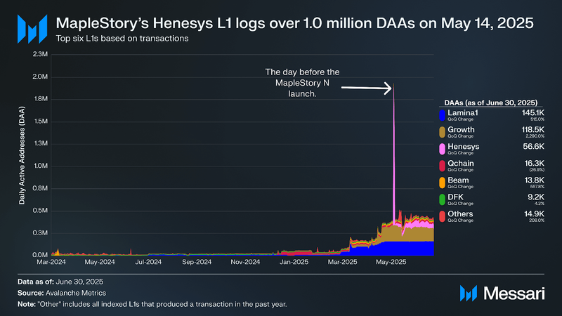 Daily active addresses (DAAs) across Avalanche L1s rose significantly in Q2’25, with the average DAA increasing 444.8% QoQ from 68,723 to 374,402. Lamina1 maintained its lead, growing 515% QoQ from 23,585 to 145,058. Notably, Henesys recorded a single-day high of over 1.0 million DAAs ahead of MapleStory N’s May 15 launch, becoming one of the top L1s by DAAs within its first month since launch.