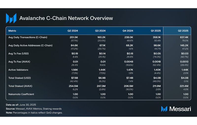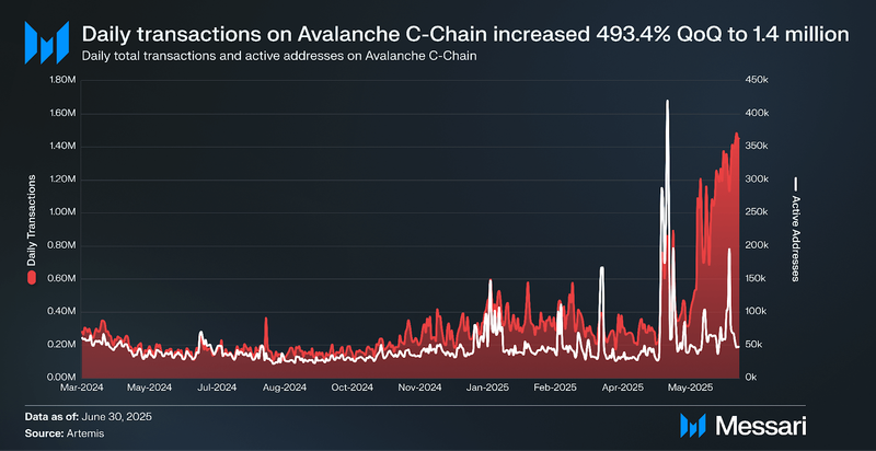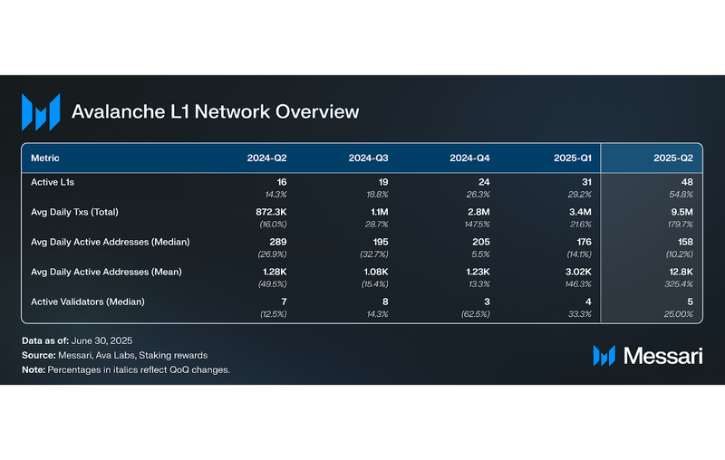 - Average daily active addresses increased 210.4% QoQ to 519,954 across Avalanche C-Chain and L1s, driven by the launch of new L1s and applications boosting onchain activity.
