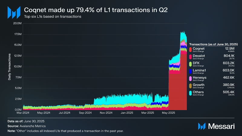 Avalanche L1s experienced heightened daily transactions in Q2’25, driven primarily by Coqnet, which accounted for 79.4% of all L1 transactions during the quarter. Although the exact cause is unclear, the spike likely stems from the launch of its first application, Dremes.fun, a gambling platform that lets users wager with meme coins.