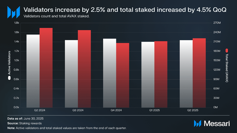 Avalanche’s validator count increased 2.5% QoQ in Q2, from 1,401 to 1,436. Total staked AVAX also grew, rising from 211.9 million AVAX to 221.4 million AVAX, a 4.5% increase.