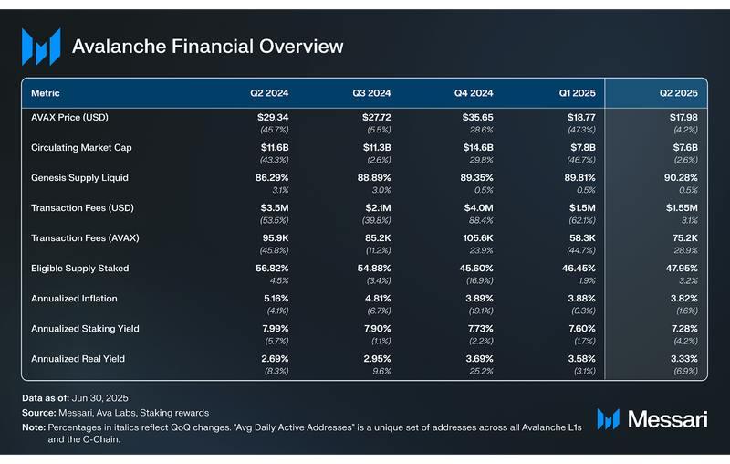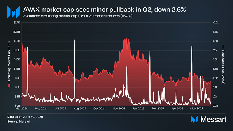 AVAX experienced a moderate price decline in Q2, falling 4.2% QoQ from $18.77 to $17.99, while its circulating market cap declined 2.6% from $7.8 billion to $7.6 billion. Despite the drop, AVAX’s price experienced reduced volatility relative to prior quarters.