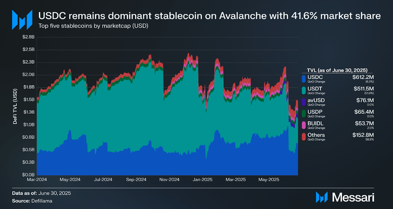 Avalanche C-Chain’s stablecoin market cap declined 23.8% QoQ in Q2’25, falling from $1.9 billion to $1.4 billion. It remained the ninth-largest chain by stablecoin market cap. USDC ended the quarter as the leading stablecoin on Avalanche, comprising 41.6% of the total with $612.2 million in supply, down 6.3% QoQ. USDT followed, representing 34.7% of the stablecoin market with $511.5 million, a 51.9% decrease from $1.1 billion. USDT’s share fell from 55.1% in Q1, marking a shift in dominance to USDC.