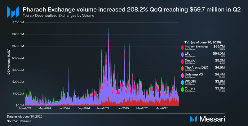 Average daily DEX volume on Avalanche C-Chain declined 17.2% QoQ in Q2’25, falling from $175.1 million to $144.8 million. Despite the broader contraction in onchain trading activity, Pharaoh emerged as the leading decentralized exchange by volume, recording a 208.2% QoQ increase from $38.3 million to $69.7 million. In contrast, LFJ experienced a 38.2% decline in average daily volume, decreasing from $87.5 million to $54.0 million. The top five DEXs by average daily trading volume in Q2 were: