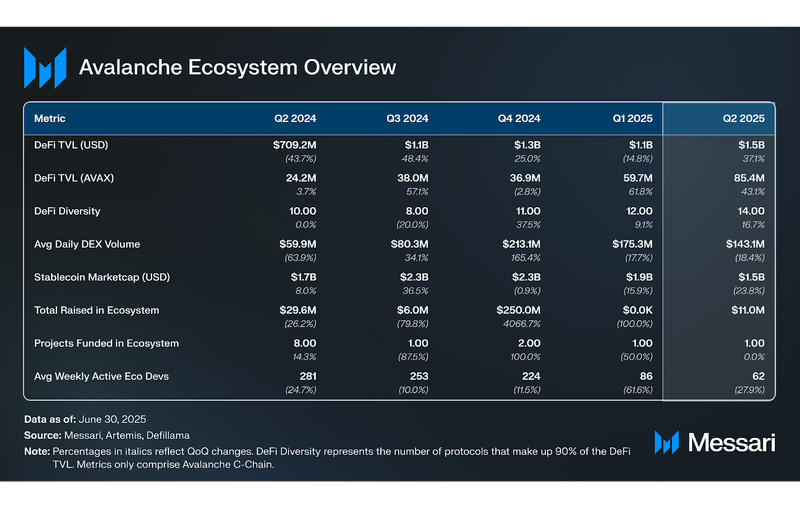 In Q2 2025, Avalanche’s C-Chain DeFi TVL (USD) increased 37.0% QoQ from $1.1 billion to $1.5 billion. TVL in AVAX rose 43.1% QoQ from 59.8 million to 85.4 million.