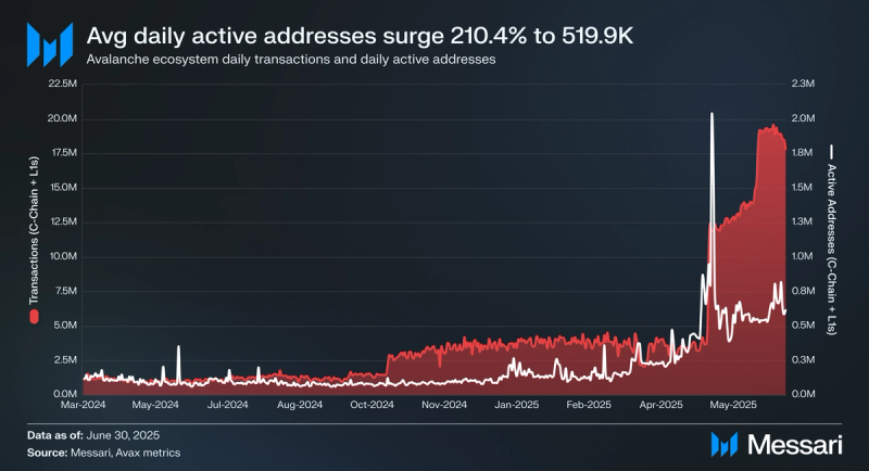 In Q2 2025, when aggregating transactions across the C-Chain and all Avalanche L1s, average daily transactions grew 169.91% QoQ to 10.1 million, up from 3.7 million in Q1’25. Over the same period, average daily active addresses (DAAs) increased by 210.45% QoQ to 519,954, up from 167,356 in Q1’25.