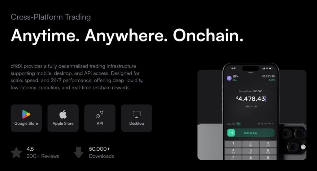 dYdX v3 offers one of the most technically advanced Ethereum futures trading experiences on a platform that does not enforce mandatory KYC. Operating entirely on StarkEx, a Layer 2 Ethereum rollup developed by StarkWare, dYdX combines the transparency of decentralized finance with the performance of traditional exchanges.
