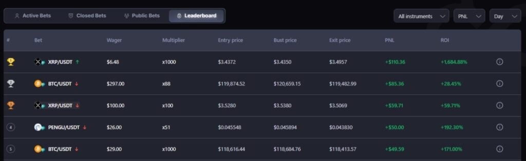 Once inside, users can access the “Crypto Futures” tab and place ETH wagers with up to 1000x multipliers. This high-exposure format appeals to those seeking fast-paced, speculative plays.
