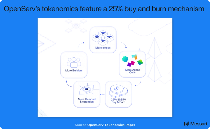 - OpenServ allocates 25% of gross platform revenue to buy SERV and burn it, linking unit‑level demand (i.e., agent calls, agentic application subscriptions, usage credits) to onchain supply reduction.