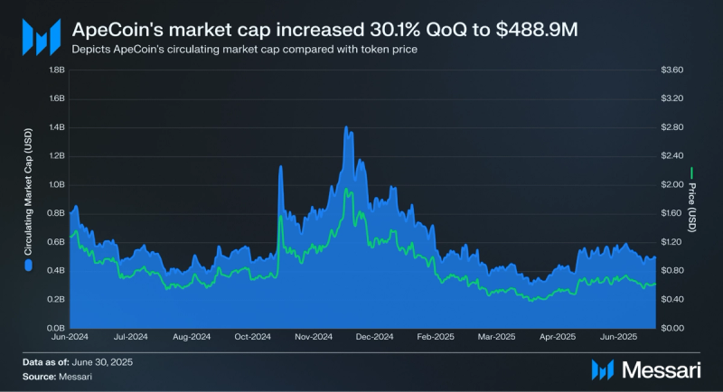 APE’s quarterly high market cap was recorded on June 10, 2025, at $592.1 million with a token price of $0.74. This period of growth for ApeCoin slightly outpaced ETH’s performance over the same time frame, which rose 27.1% in Q2.