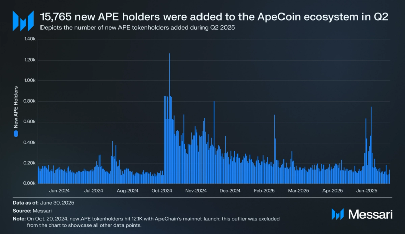 - New APE tokenholder additions dropped 24.6% QoQ, totaling 15,765. This moderation followed heightened acquisition in prior quarters driven by ApeChain incentives.