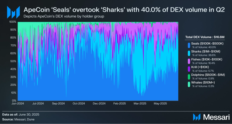ApeCoin recorded a total Q2 DEX volume of $16.6 million. Trading activity was concentrated among mid-sized holders, with Seal and Shark wallets collectively accounting for over 75.0% of total volume.