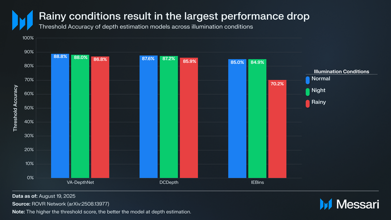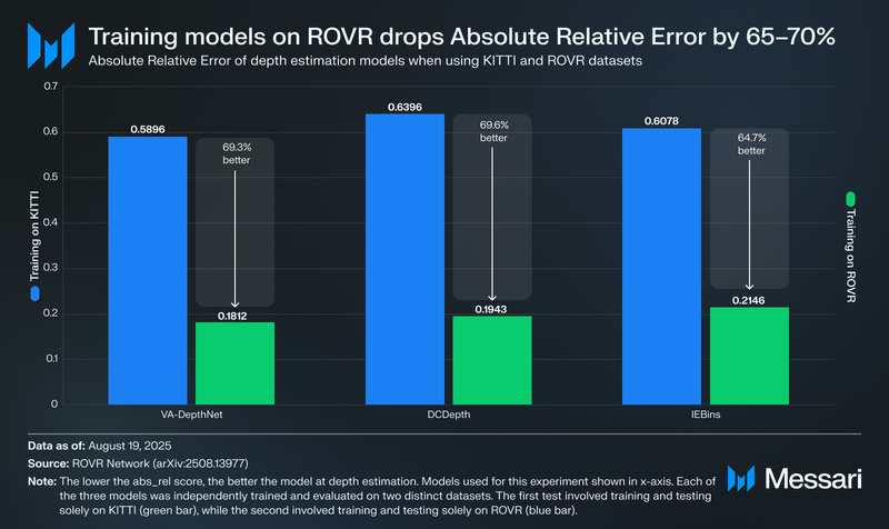 - Training on ROVR reduced absolute relative error scores across models, with VA-DepthNet, DCDepth, and IEBins down 69.3%, 69.6%, and 64.7% versus KITTI training, respectively.