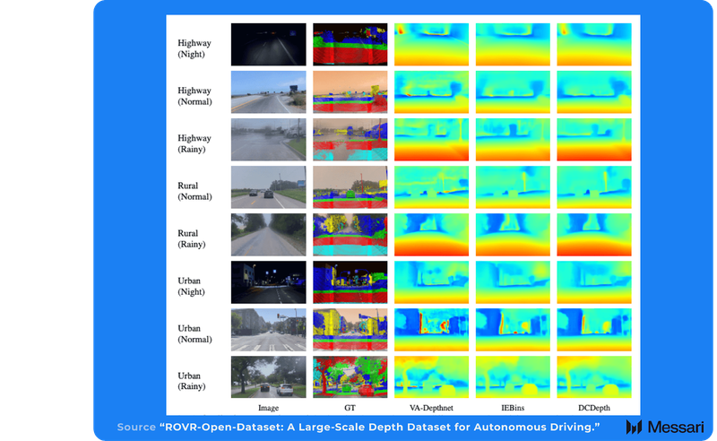 Training on ROVR improves the picture but still leaves headroom. With the same setup, VA-DepthNet’s Absolute Relative Error decreases by 69.3% when trained on ROVR instead of KITTI (from 0.5896 to 0.1812). DCDepth shows a 69.6% reduction (from 0.6396 to 0.1943), and IEBins records a 64.7% reduction (from 0.6078 to 0.2146). After training on ROVR, Absolute Relative Error is still between 0.18 and 0.21. Paired with ROVR’s broader coverage, it shows these models do not generalize as cleanly as prior, limited datasets suggested. The ROVR dataset now serves as a strong generalization benchmark to beat. Despite there being no industry standard, many teams aim for lower Absolute Error thresholds by distance and weather.