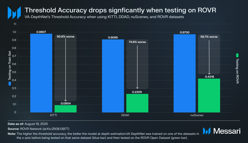Like with absolute relative error, the same phenomenon applies to threshold accuracy: models appear stronger when testing on the training set. When evaluated on their own train sets, KITTI-trained VA-DepthNet reports 0.981, DDAD reports 0.909, and nuScenes reports 0.973. However, when the exact same models are evaluated on ROVR instead of testing on the train set, VA-DepthNet falls to 0.090 (−89.1 points), DDAD drops to 0.231 (−67.9 points), and nuScenes slides to 0.422 (−55.1 points).