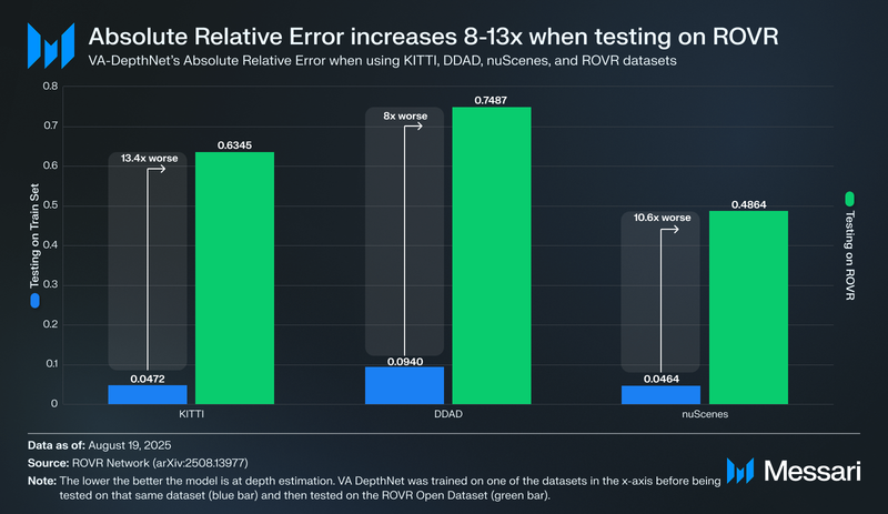 On KITTI, VA-DepthNet had an Absolute Relative Error of 0.047. Test that same model using ROVR’s Open Dataset, and the Absolute Relative Error increases to 0.635 (13.4x worse). DDAD shows the same pattern, rising from 0.094 to 0.749 (8x worse). nuScenes moves from 0.046 to 0.486 (10.6x worse). The gap points to ROVR’s Open Dataset being a more challenging benchmark relative to its peers.