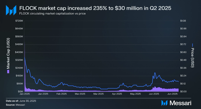 FLOCK’s circulating market capitalization increased 235% in Q2 2025, rising from $9 million to $30 million, while the token price grew 167%, from $0.06 to $0.15. The larger increase in market capitalization relative to price is due to circulating supply expanding over the quarter through staking rewards, ecosystem incentives, or scheduled token releases. The addition of Uniswap liquidity on Base also broadened market accessibility, increasing the share of tokens actively circulating. As a result, both higher valuation per token and a larger circulating supply contributed to the overall market cap growth.