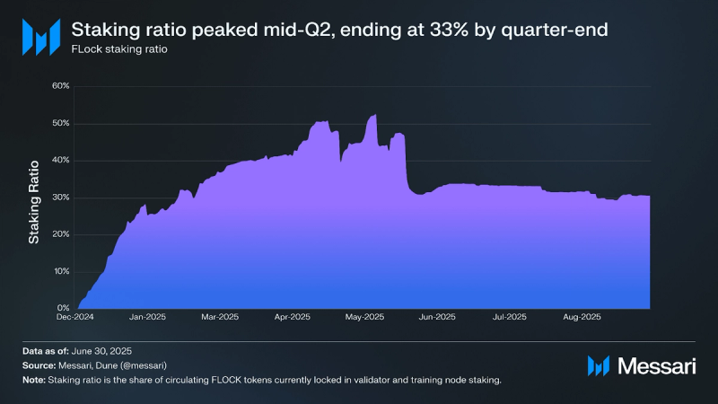 In Q2 2025, FLock introduced gmFLOCK as the staking unit for AI Arena participation. gmFLOCK is a non-transferable token generated by locking FLOCK for a user-selected period of up to 365 days, with longer lockups receiving higher multipliers. Training Nodes, Validators, and Delegators must now convert FLOCK into gmFLOCK to participate and earn rewards. The transition away from the prior staking model contributed to a sharp decline in the overall staking ratio, as previously staked tokens had to be re-locked under the new system.