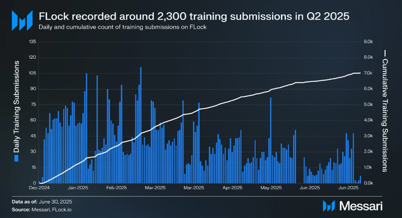 Training nodes expanded from 143 at the end of Q1 2025 to 185 by the end of Q2 2025, a 29% QoQ increase. This growth was supported by the introduction of gmFLOCK staking in late April and the AI Arena v2 upgrade in May, which reinforced incentives for node operators and delegators. New training tasks and partnerships, including integrations with Alibaba Cloud’s Qwen, Base’s Model Context Protocol, and application-focused initiatives like Baby4D and the DIMO + Beacon fuel-efficiency model, also broadened participation.
