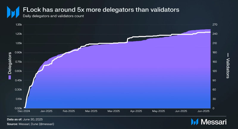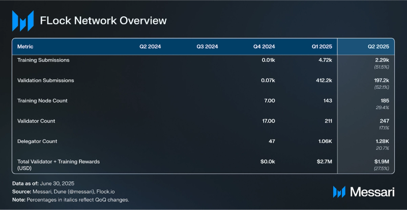 In Q2 2025, FLock’s circulating market capitalization rose 235% to $30 million, outpacing a 167% increase in token price as circulating supply expanded. The staking ratio declined from 41% to 33%, reflecting reduced incentives, profit-taking amid price appreciation, and the transition to gmFLOCK staking. Training nodes grew 29% QoQ to 185, validators increased 17% to 247, and delegators rose 21% to 1,280, while training and validation submissions fell 52% QoQ as workloads shifted toward more specialized tasks.