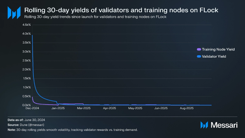 In Q1 2025, yields declined as participation scaled up: training node yields fell from 175% on January 1 to 29% by March 31, while validator yields dropped from 1,404% to 14%.