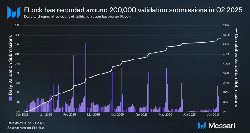 Validation submissions on FLock followed a similar trajectory to training activity. Daily submissions surged to over 412,000 in Q1 2025 but declined to about 197,000 in Q2, a 52% QoQ decrease. Despite this, cumulative validation submissions kept rising, indicating sustained engagement.