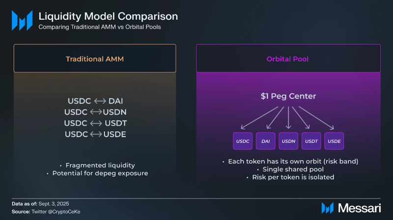 The pool mechanics draw inspiration from Paradigm’s Orbital AMM, implementing a generalization of Curve’s stableswap model. These “orbital bonding curves” concentrate liquidity near the peg, minimizing slippage and maximizing capital efficiency. Unlike constant-product models, they’re purpose-built for like-kind asset pairs that tend to maintain parity, ideal for stable-to-stable swaps across chains.